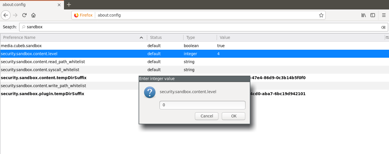 Next is to disable the sandbox. For this I set the value of security.sandbox.content.level to 0 in about:config