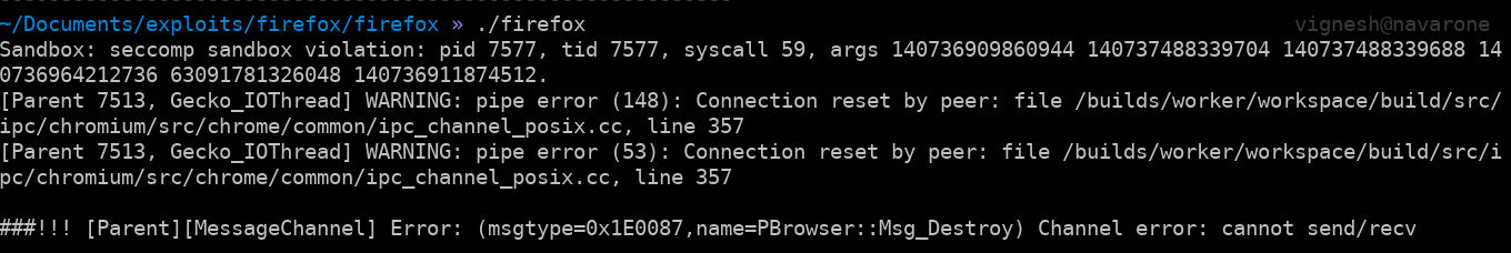 Apparently this bug was used, in combination with a firefox sandbox escape, to exploit systems in the wild. Coinbase Security recently released a blog post on how they detected this. If we enable the sandbox, then its seccomp filter catches the execve syscall and immediately crashes the tab.
